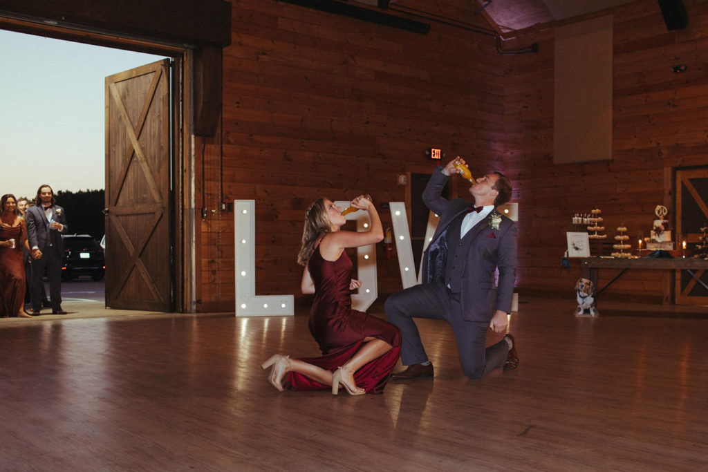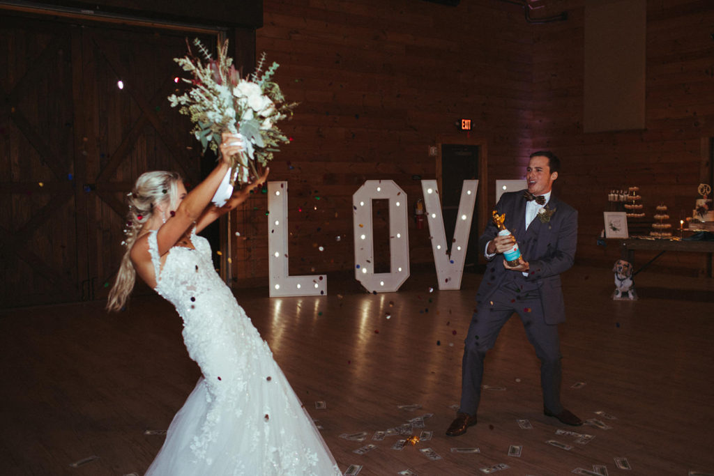 Taylor & Tanner’s love story began by her asking his number while he bartended. A few years after Tanner said yes, Taylor returned the gesture and said yes to a lifetime together! The day couldn’t have been more perfect, filled with multiple icings (yes the smirnoff ice kind), tears, and a heck of a lotta love.